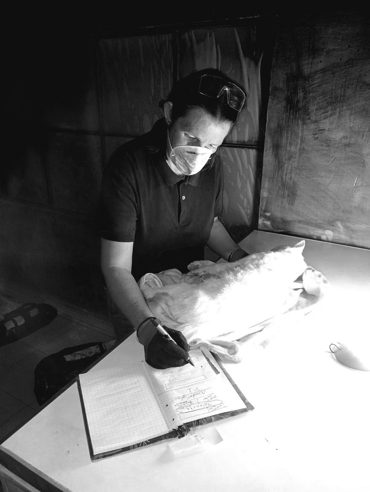 Los encargados en turno, que suelen ser jóvenes estudiantes de veterinaria, la conducen a un traspatio, o cuarto oculto, o área de refrigeración, donde yacen las mascotas sin vida encobijadas o dentro de bolsas de basura. Mi mamá las introduce con cuidado a su luctuosa maleta negra y desliza el cierre, que suena como un chirrido fantasmal. Carga los pesados kilos de lomito petrificado, por pasillos, salas de espera y escaleras hasta la camioneta. Los vivaces aspirantes a médico de animales, le quitan los obstáculos del camino y le empalagan el oído de agradecimientos. Para ellos es impactante que una señora de más de cincuenta años haga tales faenas que muchos desprecian por asco, extrañas supersticiones o simplemente por lo cansado que es cargar esos cuerpos.