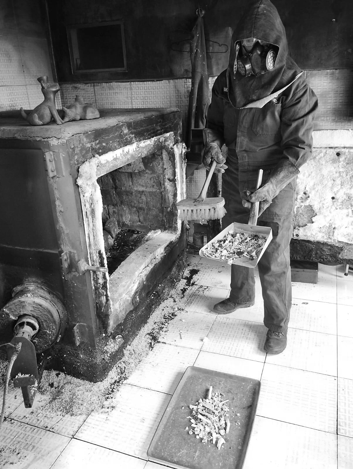 Mi mamá se pone otro traje para la batalla más difícil. Un overol negro de lona, pasamontañas de mezclilla, casco de soldador, mascarilla, guantes de carnaza y botas. Mete a los perros en sus respectivos lugares dentro del horno, el cual es un cubo de dos por dos metros hecho con tabicón, cemento refractario y lana de roca. Cierra la pesada puerta de acero para sellar ese tiznado averno y enciende las manivelas del gas para alimentar las hornillas que lanzan unos estruendosos fogonazos rojiazules. Prende un extractor de aire cuyas veletas meten oxígeno al cuarto para que no se ahogue la lumbre. Por último, activa un soplete en la entrada de la chimenea metálica que va quemando los residuos que revolotean entre la humareda.